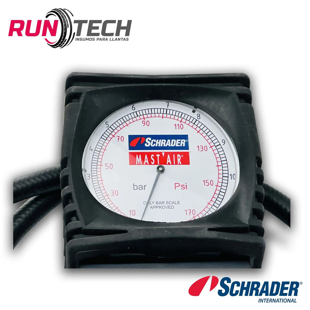 Calibrador/Inflador marca Schrader con clip para manguera de 1,5 metros, 10-170 PSI.