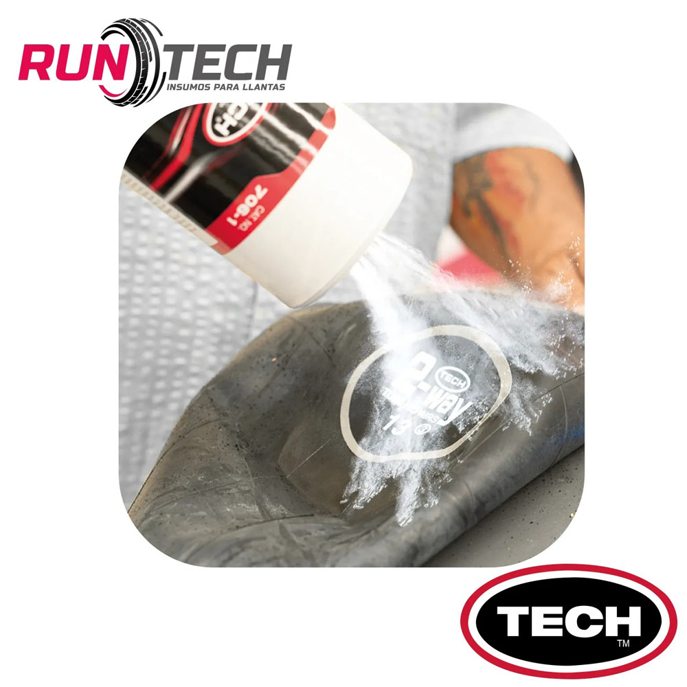 TECH Tire Talc es un producto en polvo especialmente formulado que se aplica a una cámara o reparación de neumático una vez que se instala en un neumático, eliminando así la posibilidad de que se doblen y se peguen los bordes de la reparación al neumático, lo que podría contribuir a la fricción.